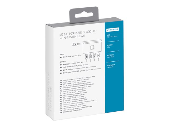 Description du produit DICOTA USB-C Portable Docking 4-in-1 with HDMI - station d'accueil - USB-C - HDMI Type de Produit Station d'accueil Interface de station d'accueil USB-C Interfaces vidéo HDMI Dimensions (LxPxH) 9 cm x 6 cm x 1.57 cm Poids 59 g Couleur Blanc Alimentation Alimentation fournie Garantie du fabricant Garantie de 2 ans -