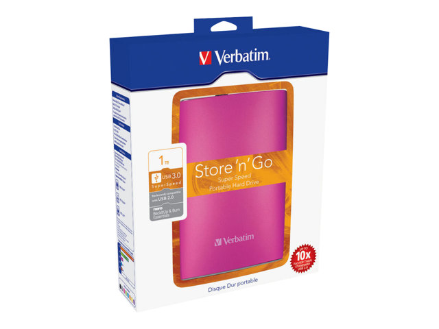 Le disque dur portable Verbatim Store 'n' Go est une solution de stockage hautes performances qui utilise une interface USB 3.0 haute vitesse. La norme USB 3.0 permet d'atteindre des débits multipliés par 10 par rapport à l'USB 2.0 (sur la base de mesure de la vitesse de bus USB), vous offrant un taux de transfert de données ultra-rapide.